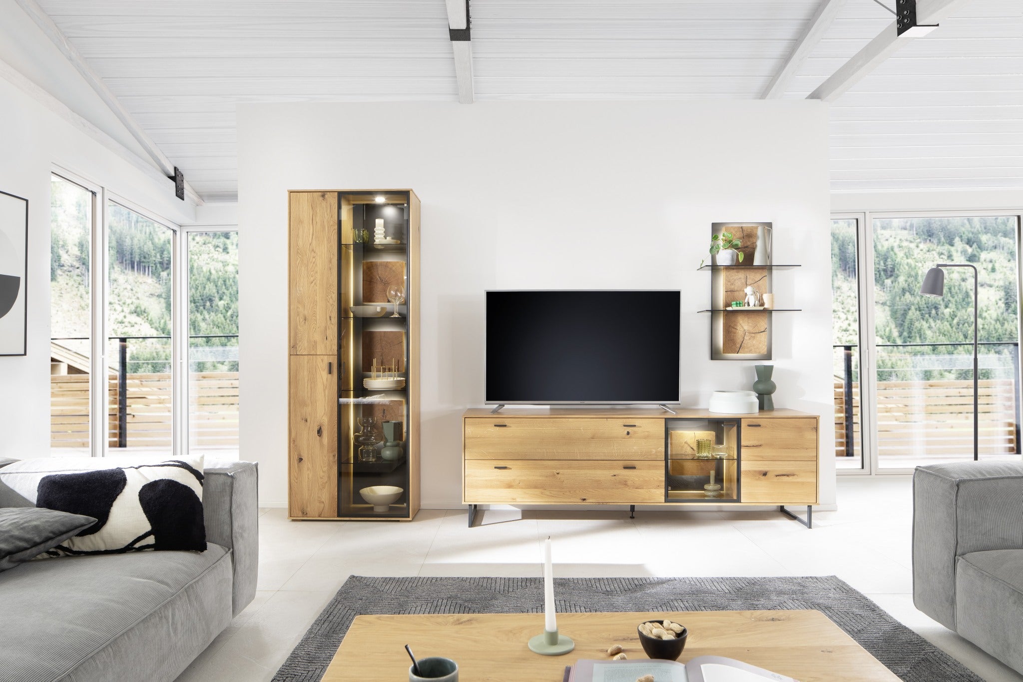 - Korpus: Ast-/ Balkeneiche furniert, Wildeiche geölt, innen Wildeiche Melamin Nachbildung