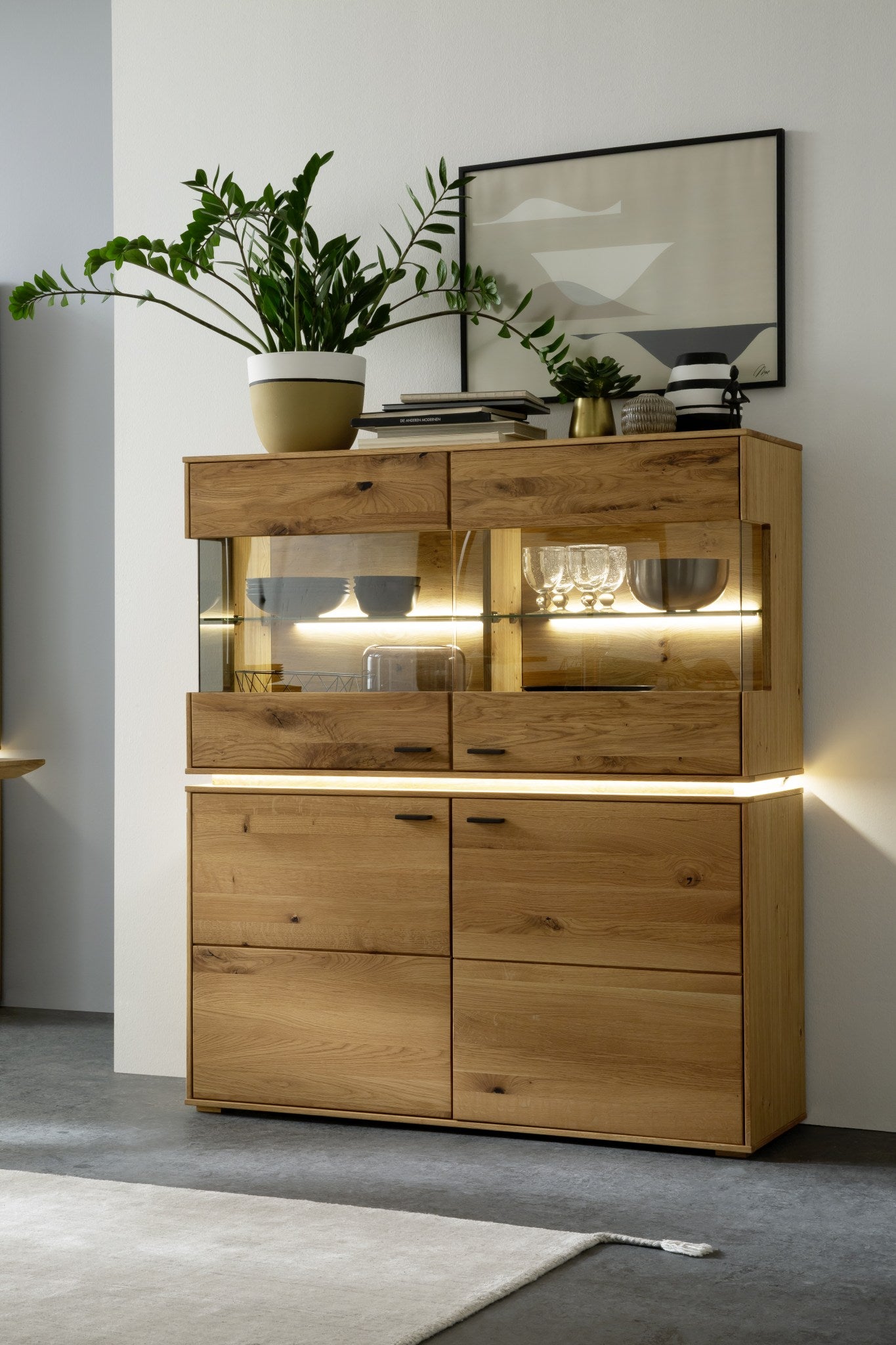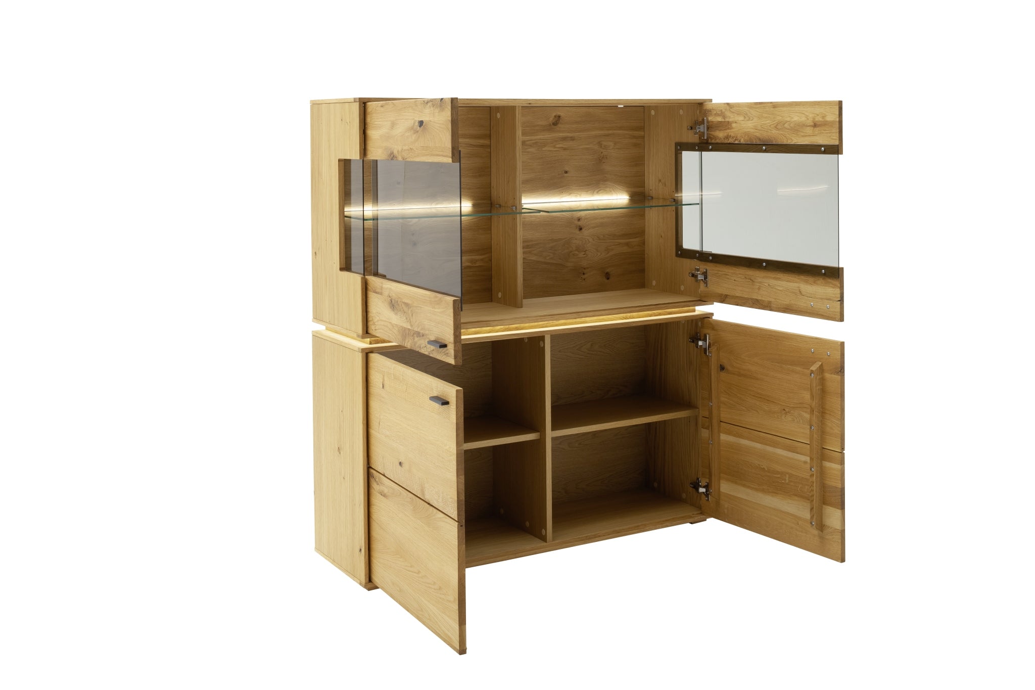 - Rückwand: sichtbar: Asteiche furniert, Oberfläche geölt hinter Türen & Schubkästen: Wildeiche Nachbildung