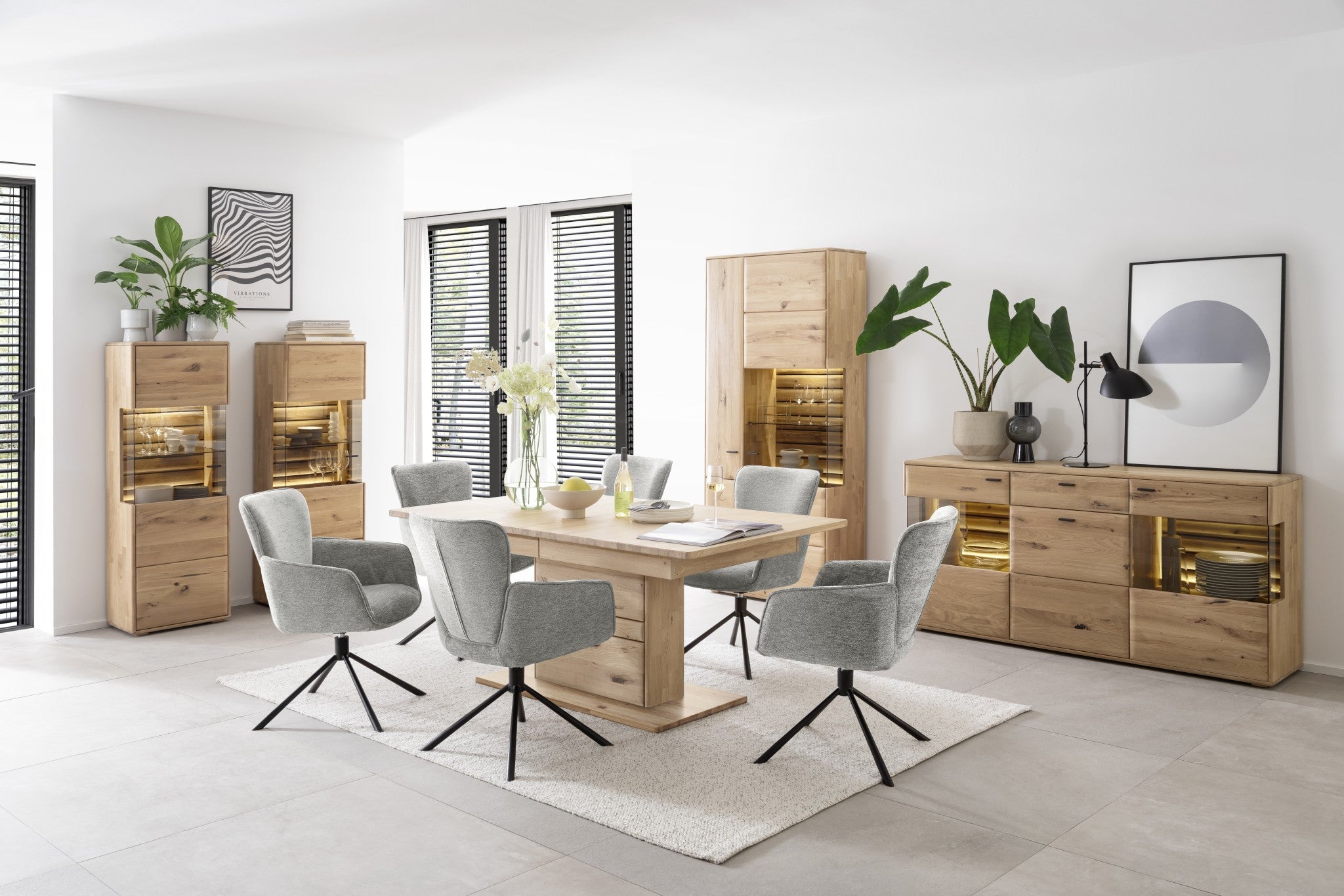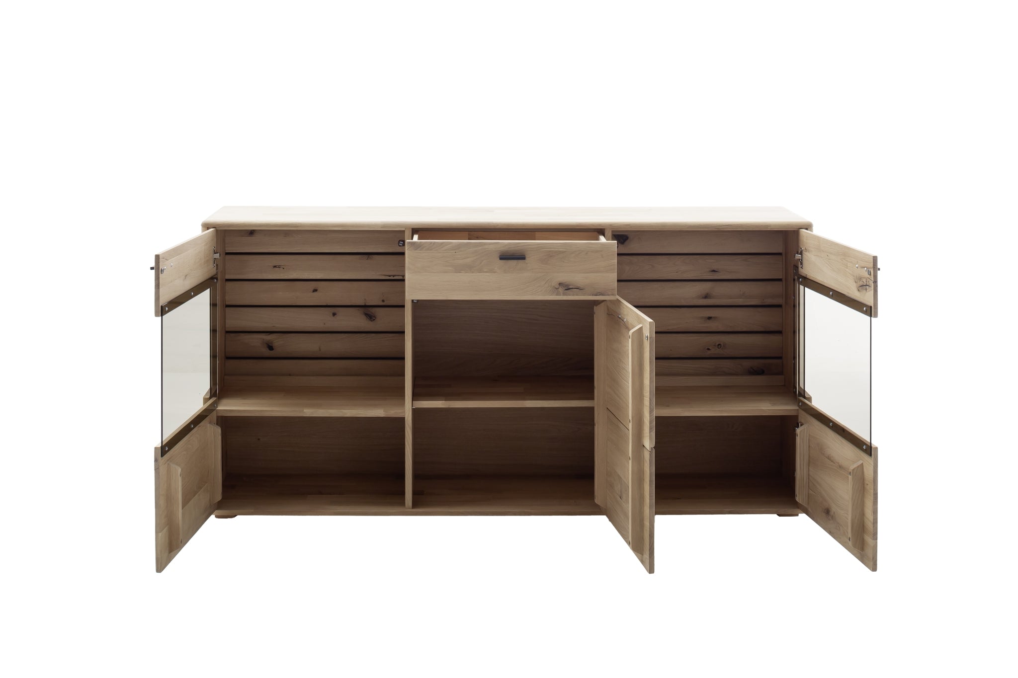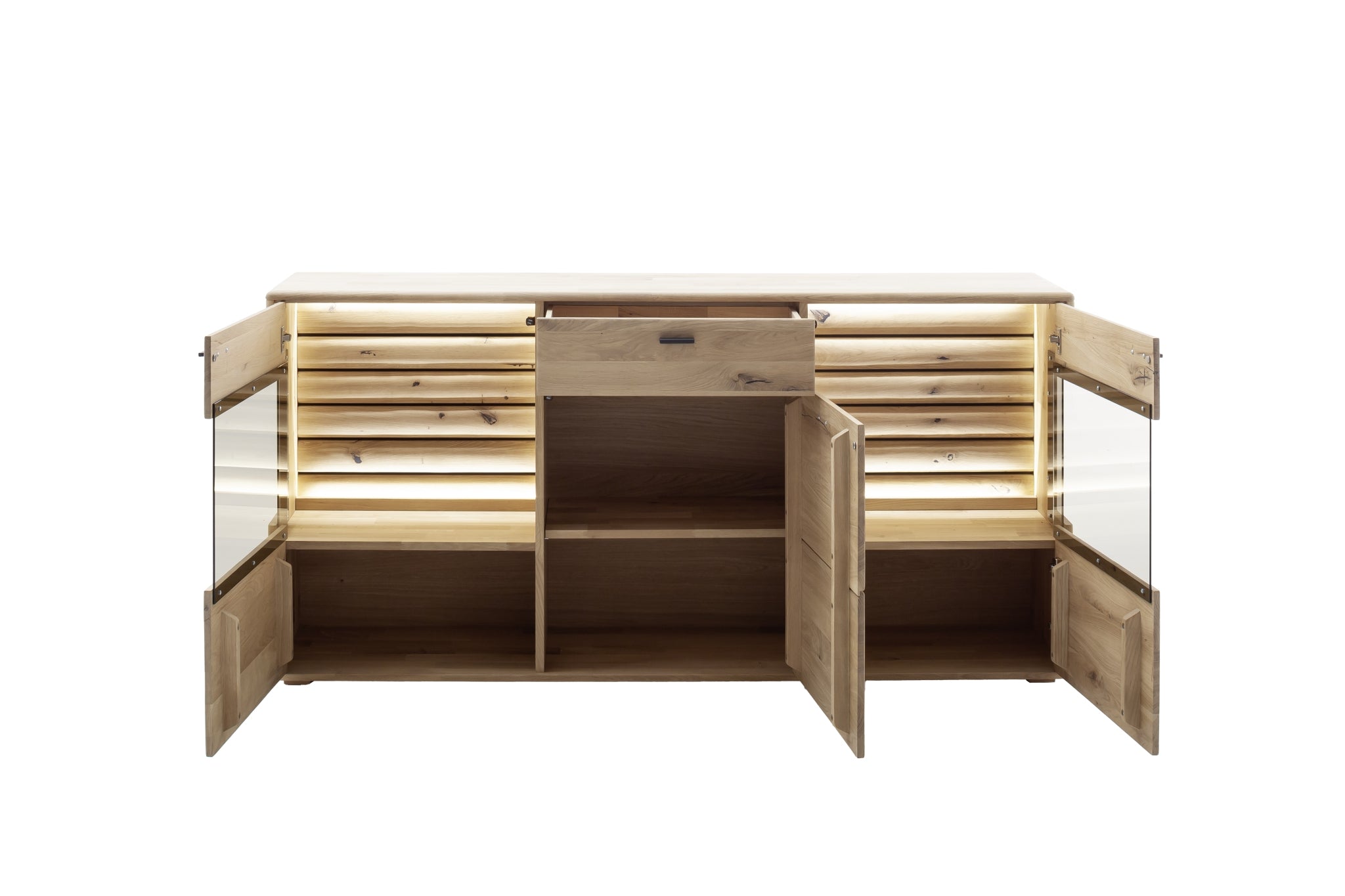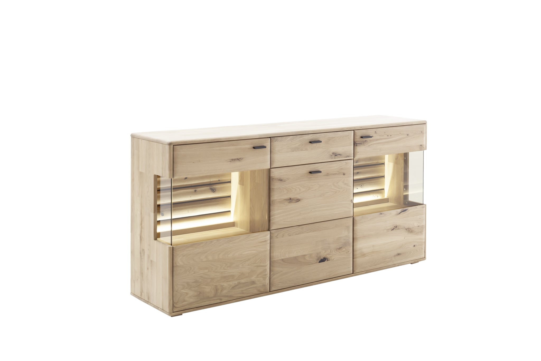 - Rückwand: sichtbar: Ast- / Balkeneiche Leisten massiv in Kristalleiche geölt mit Schattenfuge hinter Türen & Schubkästen: Ast- / Balkeneiche furniert in Kristalleiche geölt