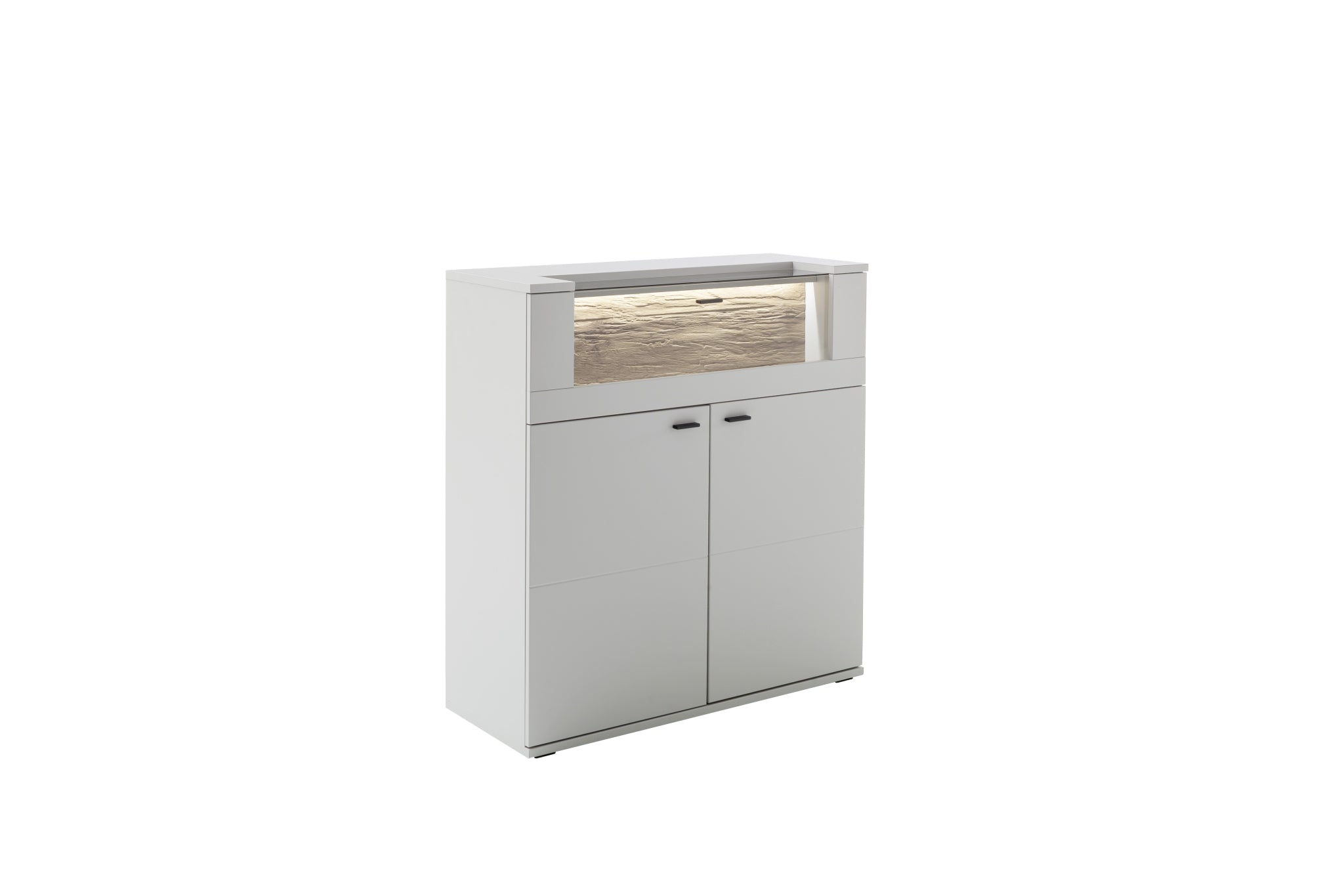 - Rückwand: sichtbar: Wotan Eiche 3D sandgestrahlt Nachbildung hinter Türen: Modern white Nachbildung