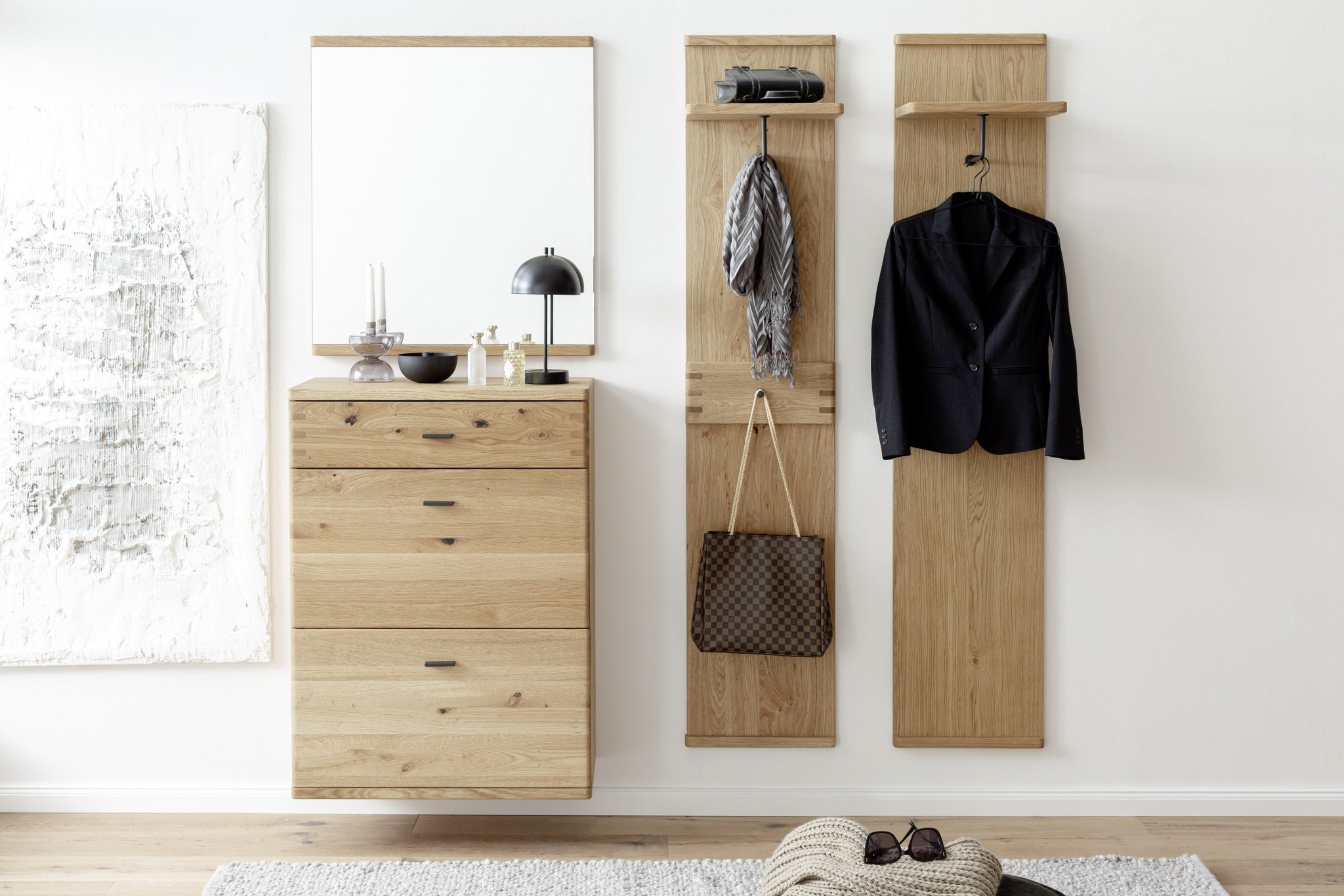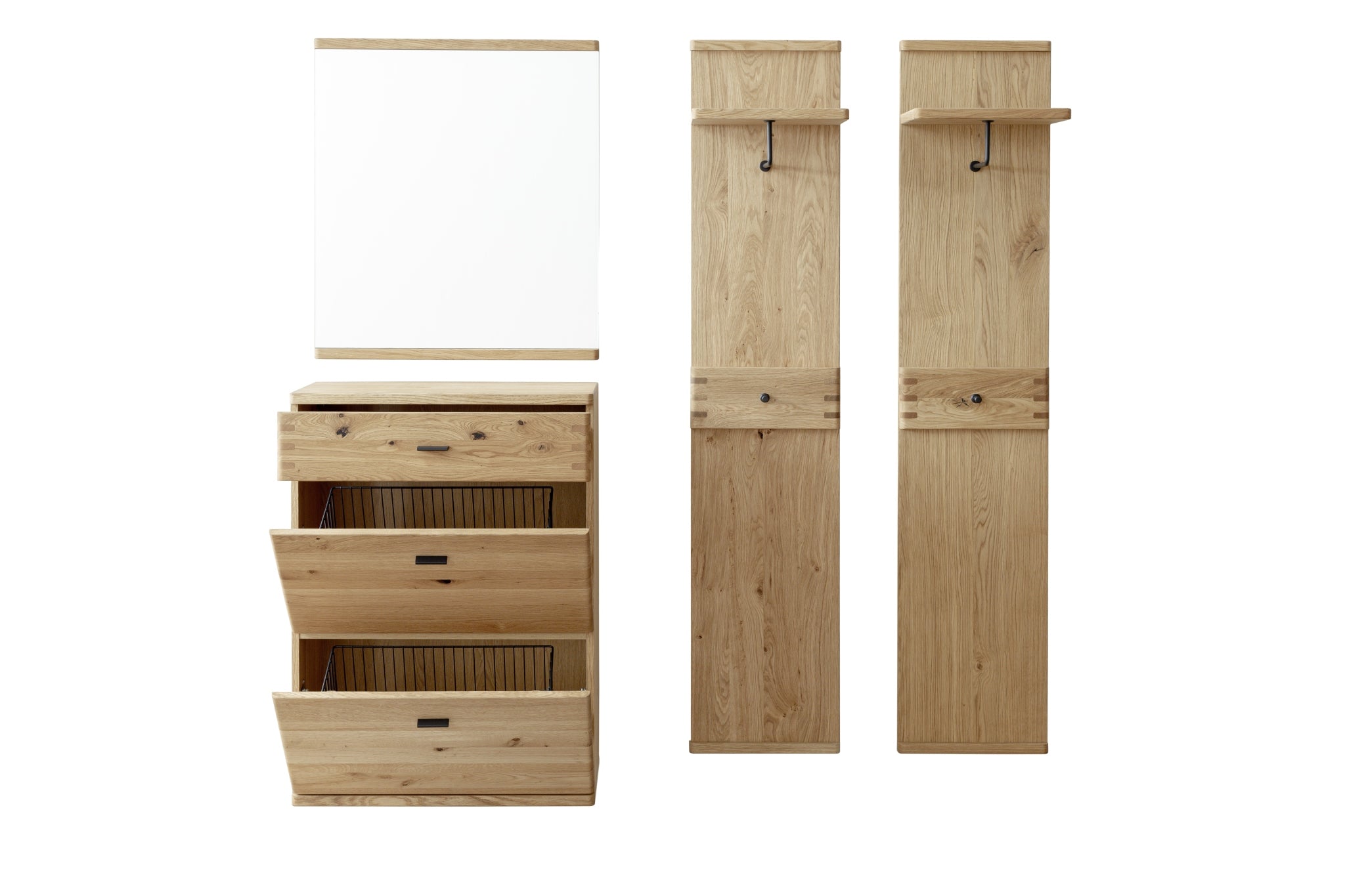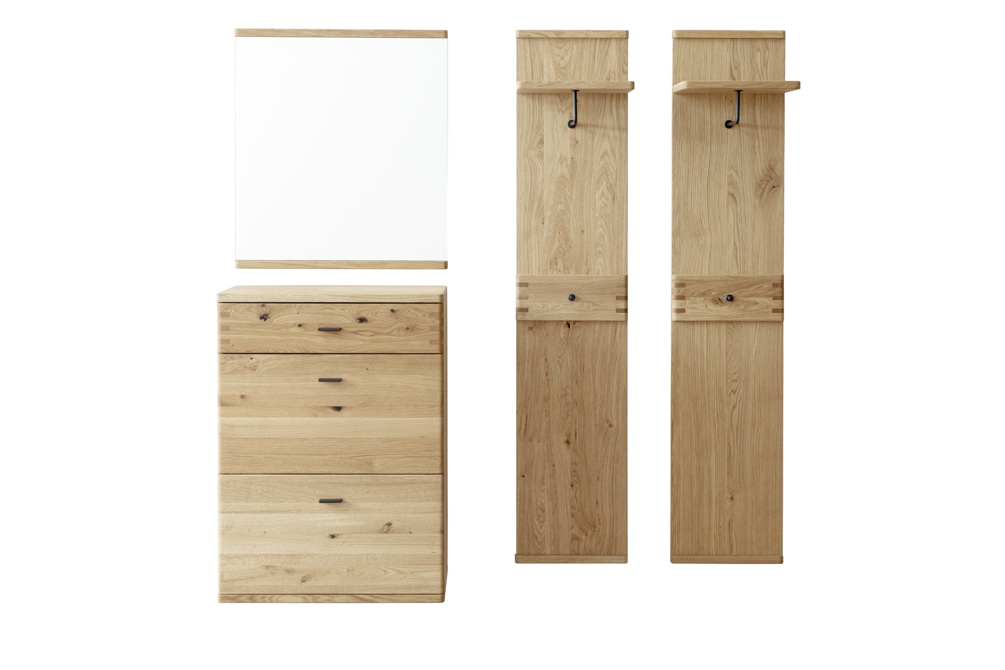 hinter Türen und Schubkästen: Wildeiche Nachbildung - Kleiderstange, Haken & Griffe: Metall schwarz-grau