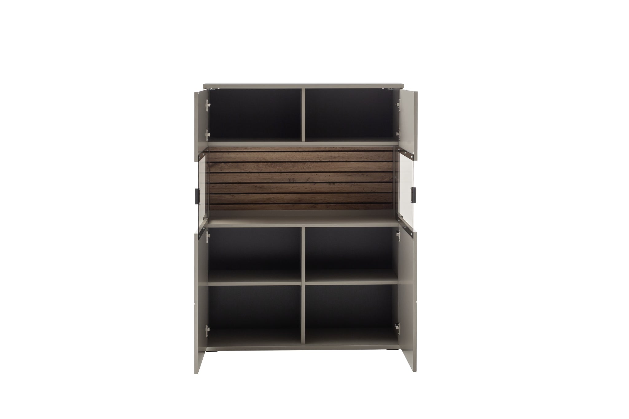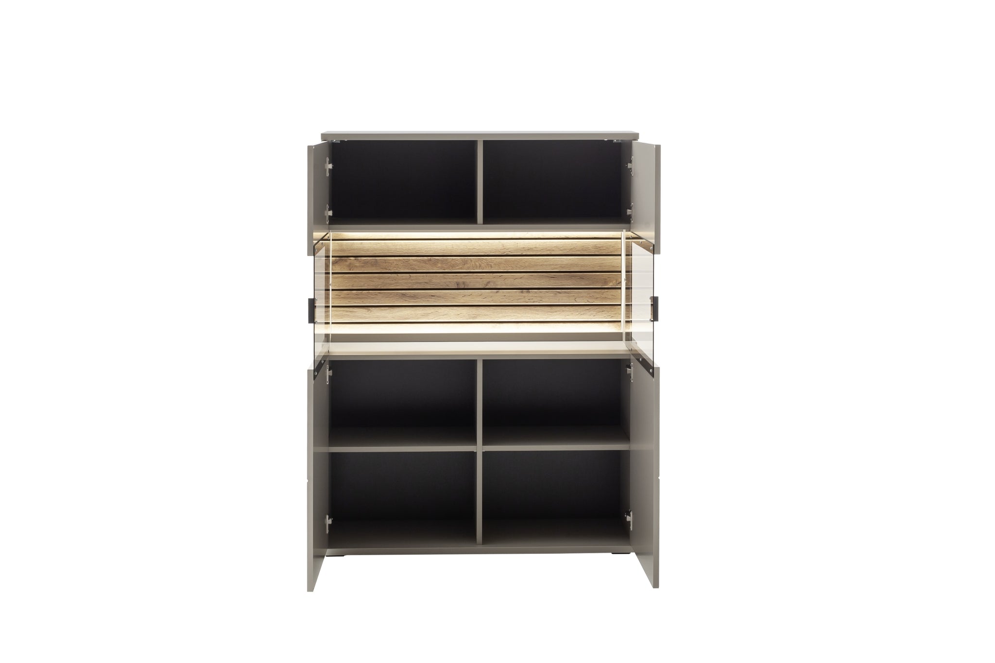 - Rückwand: sichtbar: Wotan Eiche Leisten ummantelt mit Schattenfuge hinter Türen: anthrazit Nachbildung