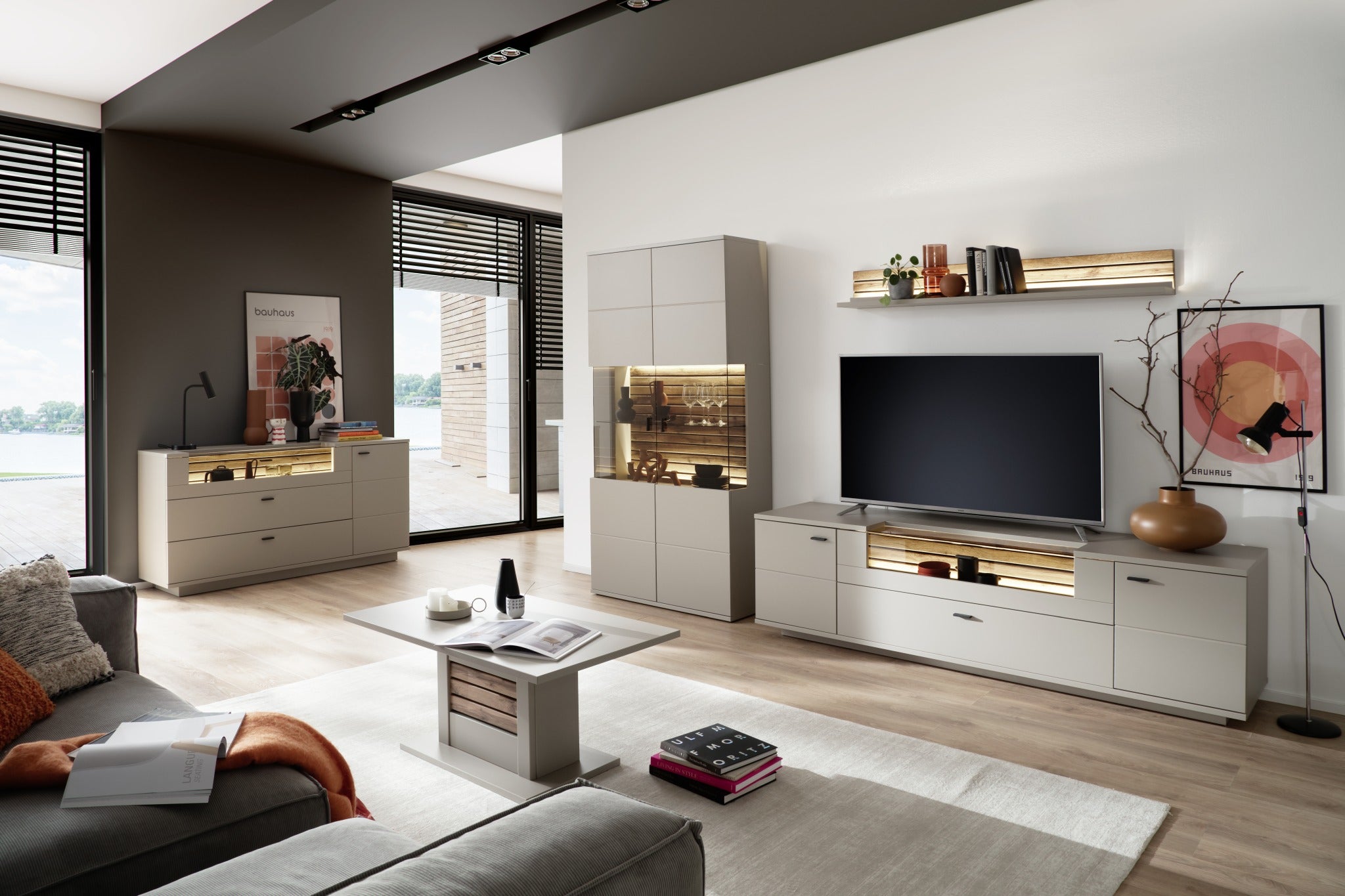 - Rückwand: sichtbar: Wotan Eiche Leisten ummantelt mit Schattenfuge hinter Türen & Schubkästen: anthrazit Nachbildung