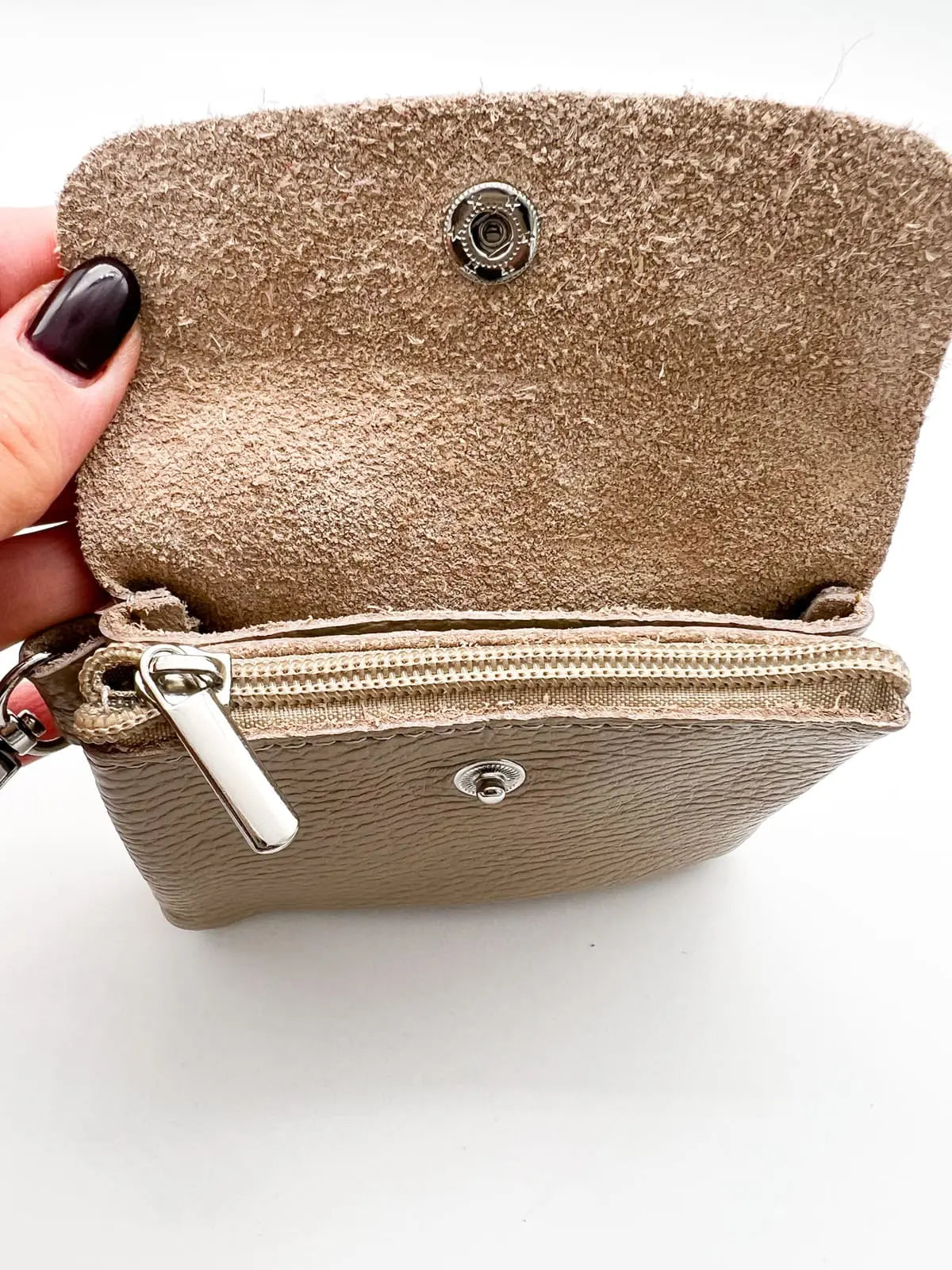 Stylisch & praktisch unterwegs. In unseren Mini Bags MIAMI kannst Du die wichtigsten Dinge für unterwegs verstauen: Münzen, Karten, Lippenstift oder auch Gassigehbeutel. Einfach dank des Karabiners mit einem Handgriff an die Handykette oder die Handtasche befestigen. Maße & Material: Obermaterial: 100% Leder Innenfutter: aufgerautes Leder 2x Innenfächer für Karten & 1x Innenfach mit Reißverschluss Strapazierfähige Metallkarabiner in silber Breite: ca. 11,5 cm Höhe: ca. 8,5 cm Höhe: ca. 2,5 cm Lieferumfang: Mini Bag ohne Hülle oder Gurt