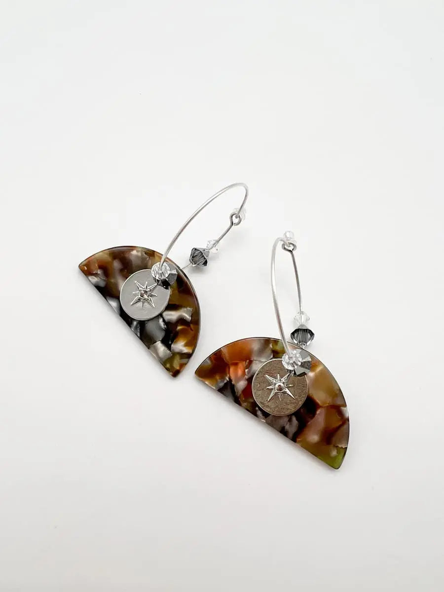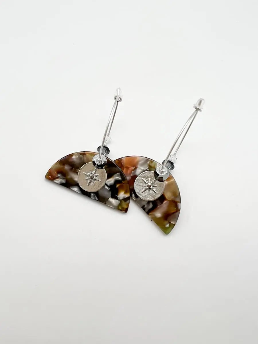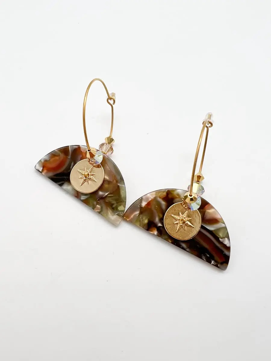 Bringt Farbe in Euren Style mit den Ohrringen TORTOISE STAR. Die bunten Acrylplättchen in stylischem Schildplattmuster sind ultraleicht und verleihen Deinem Outfit pures Summerfeeling. Kleine Kristalle sorgen für das besondere funkeln Material: Metalllegierung, vergoldet oder silber, blei- und nickelfrei, Kristalle Durchmesser Creole: 3 cm Länge Ohrringe: 5 cm Breite Ohrringe: 4 cm Handmade in München