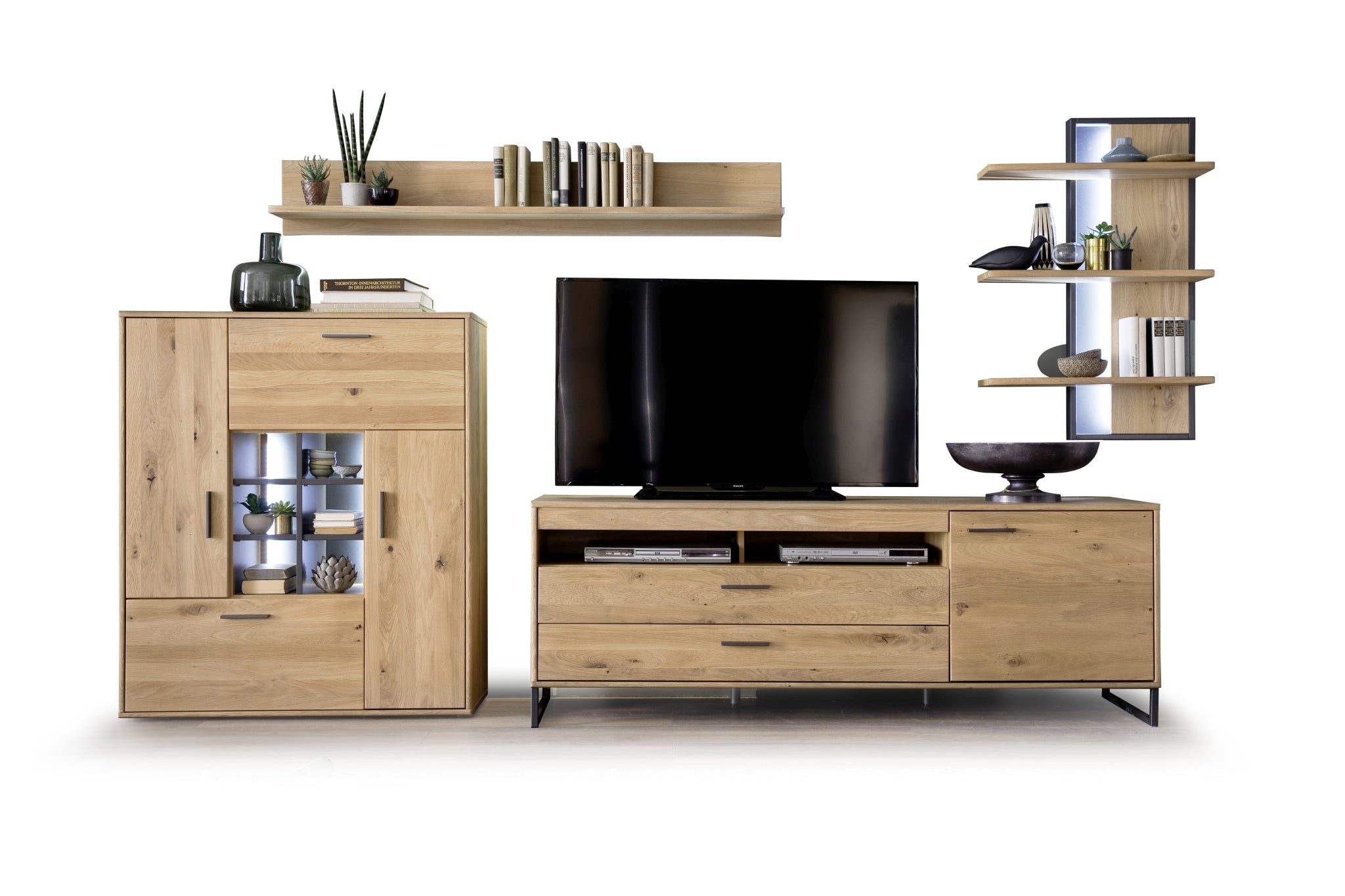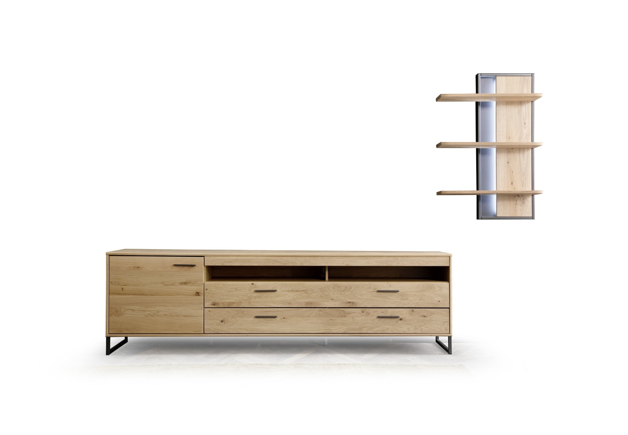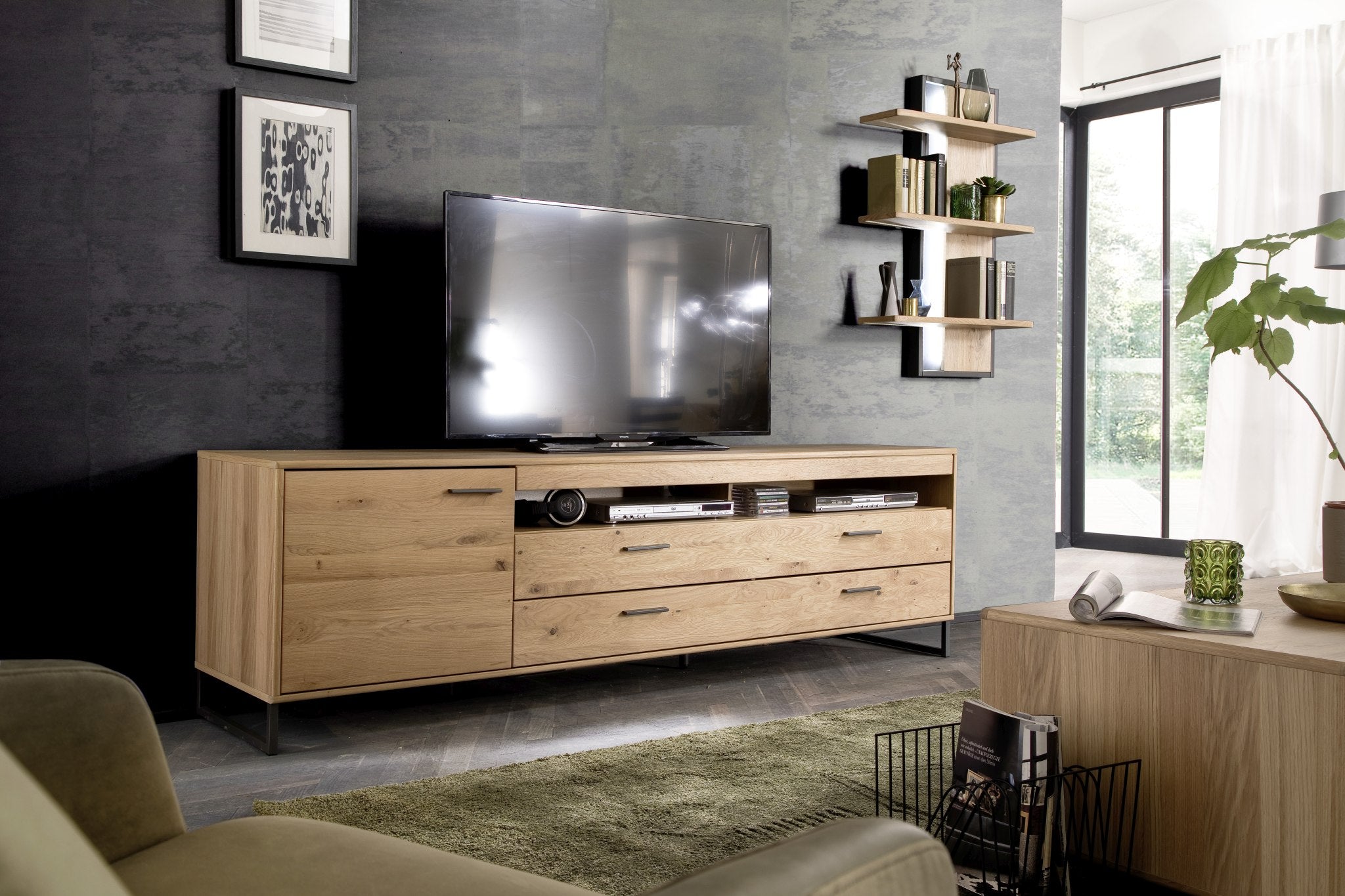 - Korpus: außen: Eiche Bianco furniert geölt / innen: Eiche Bianco Dekor Nachbildung