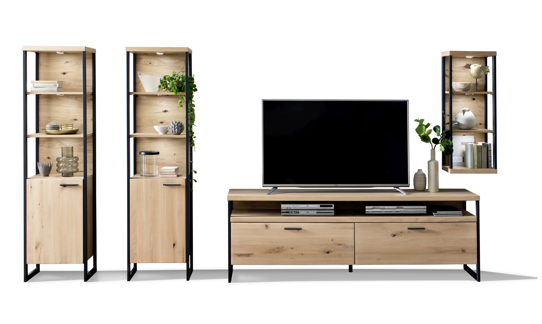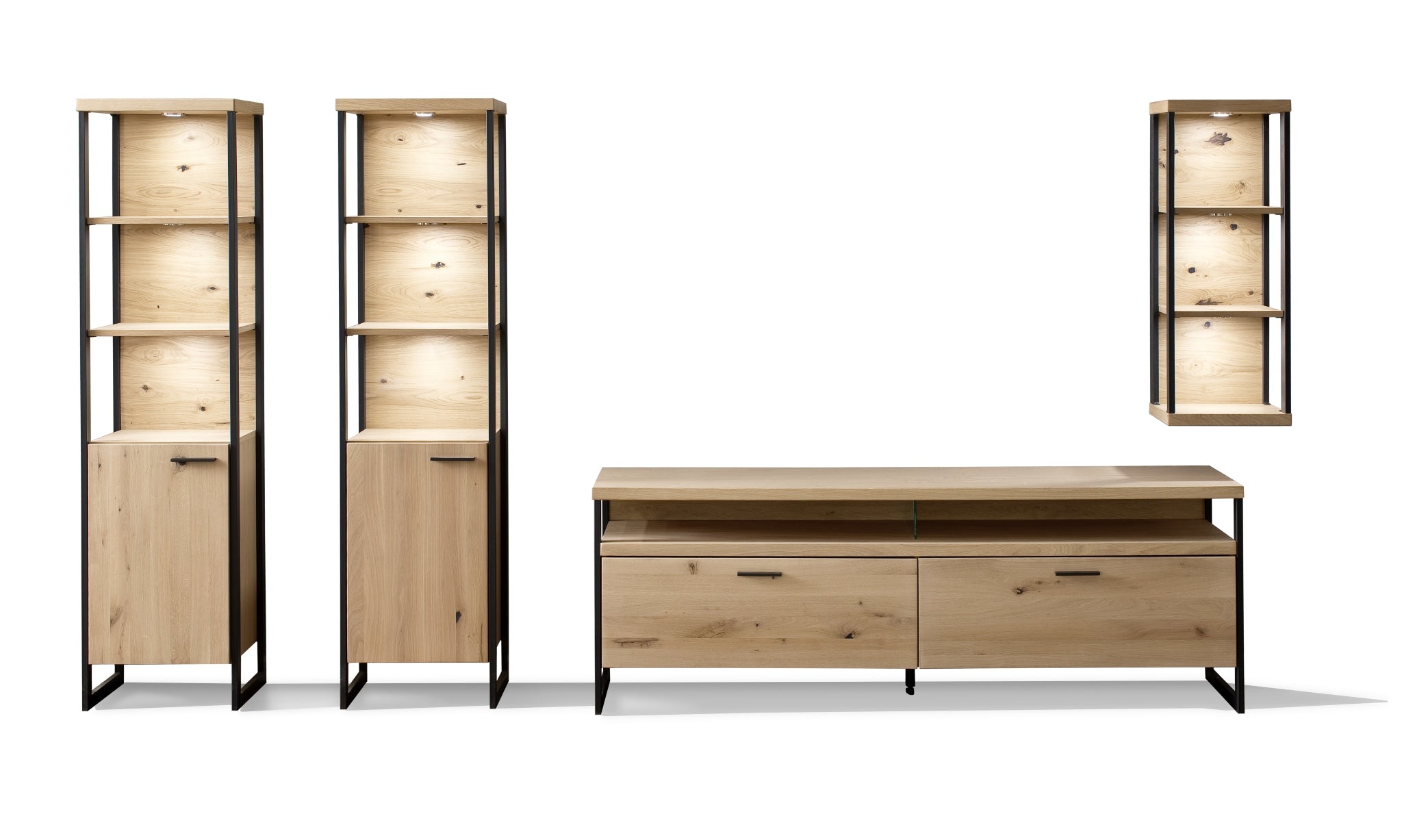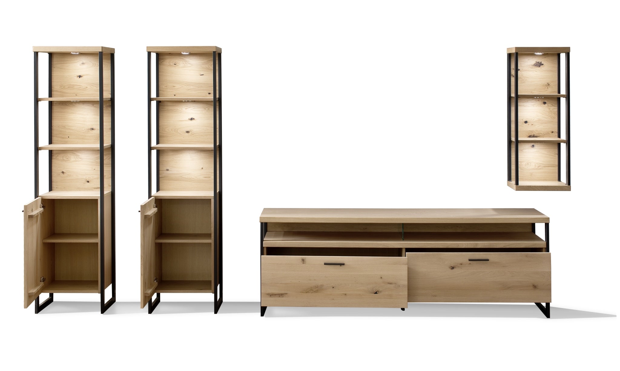 hinter Türen und Schubkästen: Eiche Bianco Nachbildung - Metallrahmen & Metallböden: schwarzgrau